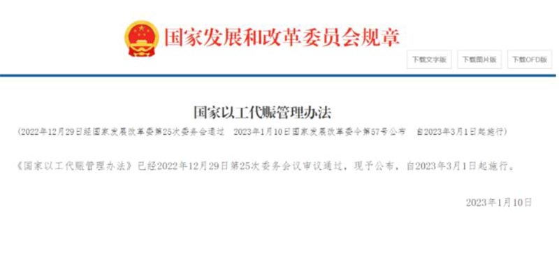 2023年1月19日,國家發(fā)改委發(fā)布《國家以工代賑管理辦法》(簡稱《辦法》),自2023年3月1日起施行。